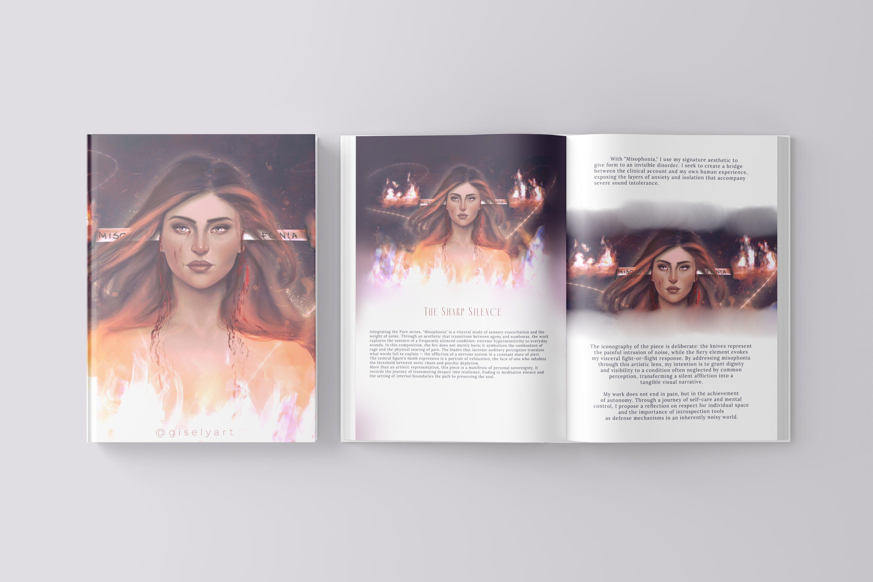 EN With "Misophonia," I use my signature aesthetic—Dark Romanticism—to give form to an invisible disorder. I seek to create a bridge between the clinical account and my own human experience, exposing the layers of anxiety and isolation that accompany severe sound intolerance.The iconography of the piece is deliberate: the knives represent the painful intrusion of noise, while the fiery element evokes my visceral fight-or-flight response. By addressing misophonia through this artistic lens, my intention is to grant dignity and visibility to a condition often neglected by common perception, transforming a silent affliction into a tangible visual narrative.My work does not end in pain, but in the achievement of autonomy. Through a journey of self-care and mental control, I propose a reflection on respect for individual space and the importance of introspection tools as defense mechanisms in an inherently noisy world.----BR Com "Misofonia", utilizo minha assinatura estética para dar forma a um distúrbio invisível. Busco criar uma ponte entre o relato clínico e a minha própria experiência humana, expondo as camadas de ansiedade e isolamento que acompanham a intolerância severa ao som.A iconografia da peça é deliberada: as facas representam a intrusão dolorosa do ruído, enquanto o elemento ígneo evoca minha resposta visceral de luta ou fuga. Ao abordar a misofonia sob esta lente artística, minha intenção é conferir dignidade e visibilidade a uma condição frequentemente negligenciada pelo senso comum, transformando uma aflição silenciosa em uma narrativa visual tangível.Meu trabalho não se encerra na dor, mas na conquista da autonomia. Através de uma jornada de autocuidado e controle mental, proponho uma reflexão sobre o respeito ao espaço individual e a importância de ferramentas de introspecção como mecanismos de defesa em um mundo inerentemente ruidoso.