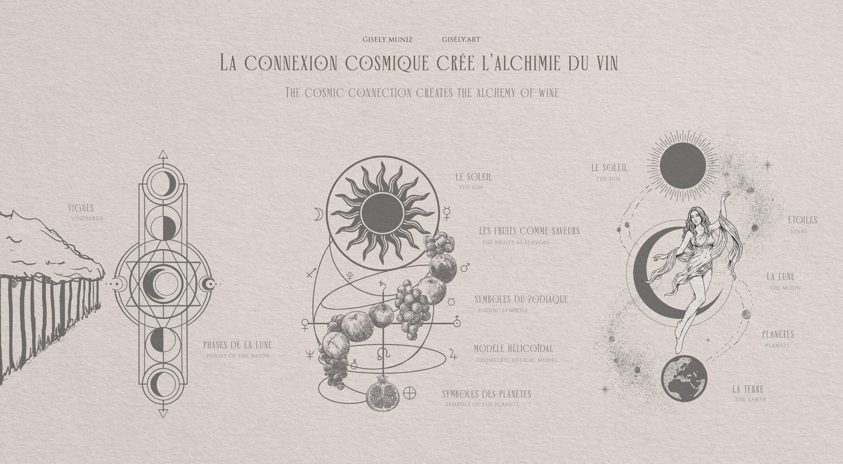 The ultimate alignment. Inspired by the rare astronomical phenomenon, the female figure embodies the soul of wine, connecting the Sun, the Moon, and the Earth in a dance of complexity and depth. It is the densest and most robust label, representing the pinnacle of the process where technique meets transcendence.O alinhamento máximo. Inspirado no raro fenômeno astronômico, a figura feminina personifica a alma do vinho, conectando o Sol, a Lua e a Terra em uma dança de complexidade e profundidade. É o rótulo mais denso e robusto, representando o ápice do processo onde a técnica encontra a transcendência.