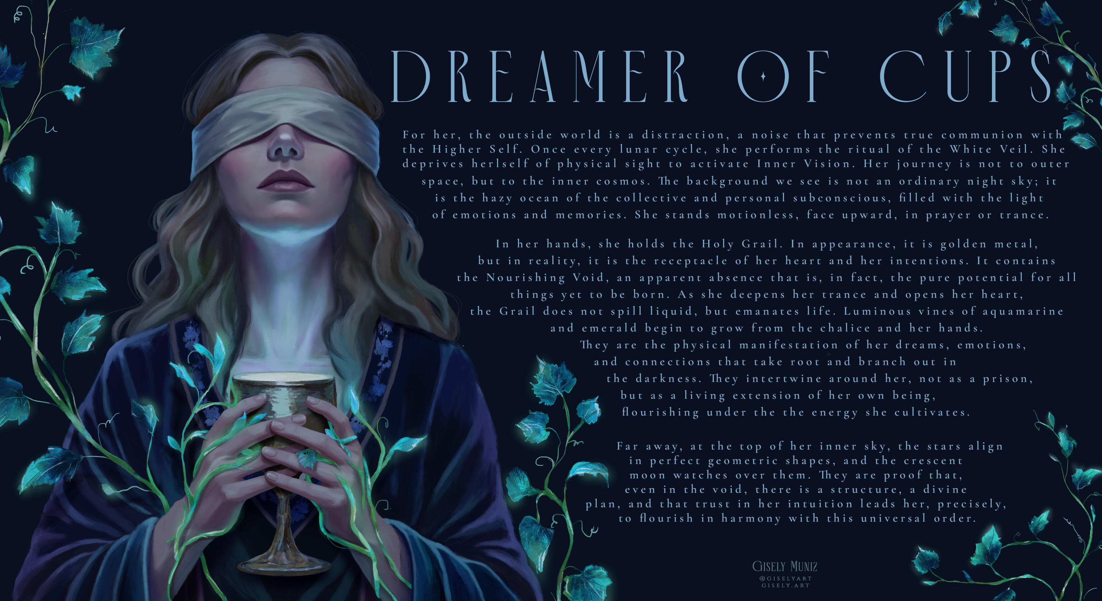 A Priestess of Dreams navigates the ocean of her subconscious, where willful blindness allows her soul to blossom from the void, guided by the hidden order of the cosmos.