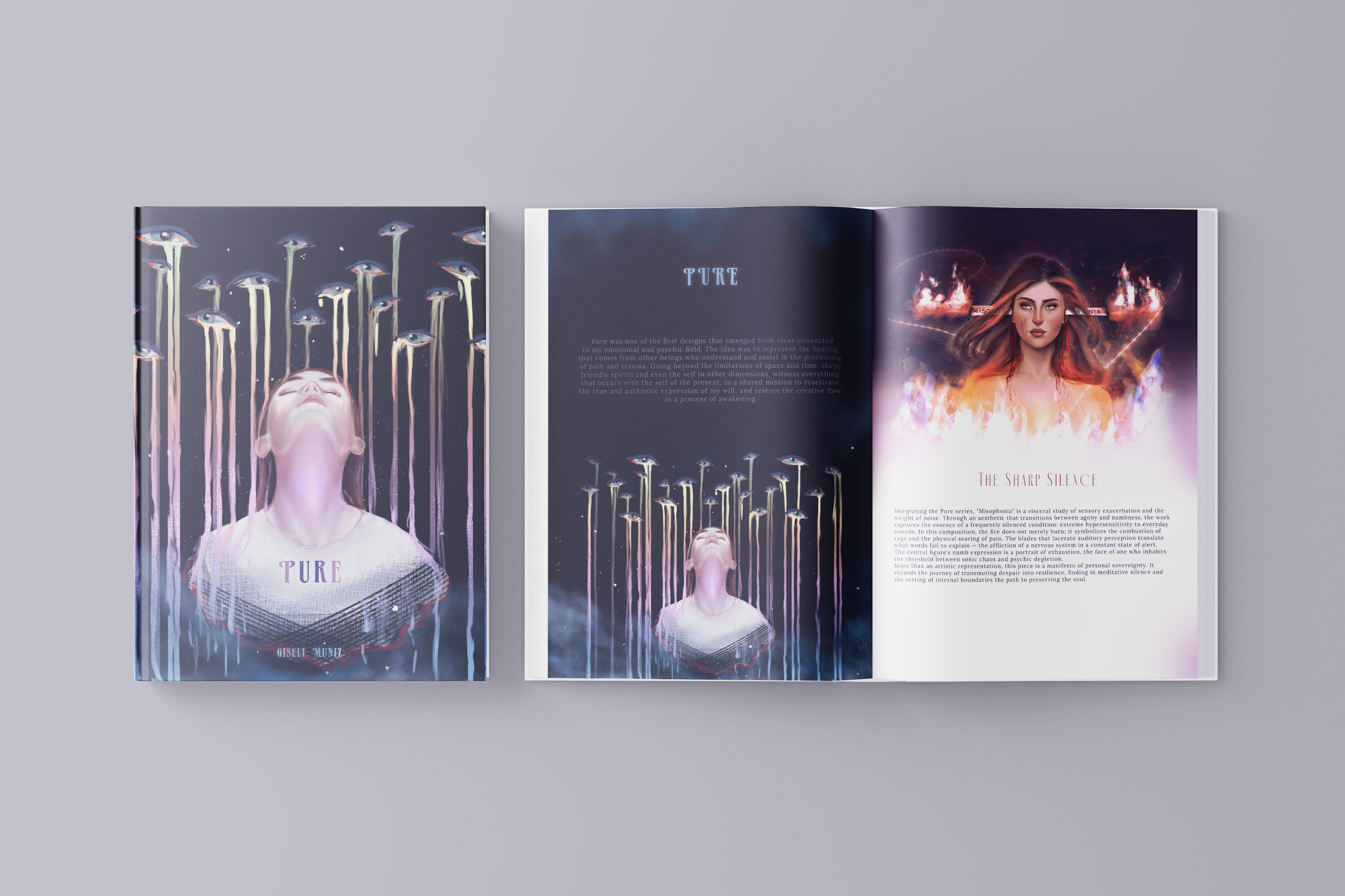 Integrando a série Pure, a obra "Misofonia" é um estudo visceral sobre a exacerbação sensorial e o peso do ruído. Através de uma estética que transita entre a agonia e o entorpecimento, o trabalho captura a essência de uma condição frequentemente silenciada: a hipersensibilidade extrema a sons cotidianos. Na composição, o fogo não apenas arde; ele simboliza a combustão da raiva e a queimação física da dor. As lâminas que laceram a percepção auditiva traduzem o que as palavras falham em explicar — a aflição de um sistema nervoso em constante estado de alerta. A expressão apática da figura central é o retrato do esgotamento, a face de quem habita o limite entre o caos sonoro e a exaustão psíquica.Mais do que uma representação artística, esta peça é um manifesto de soberania pessoal. É o registro da jornada de transmutar o desespero em resiliência, encontrando no silêncio meditativo e na imposição de limites internos o caminho para a preservação da própria alma.