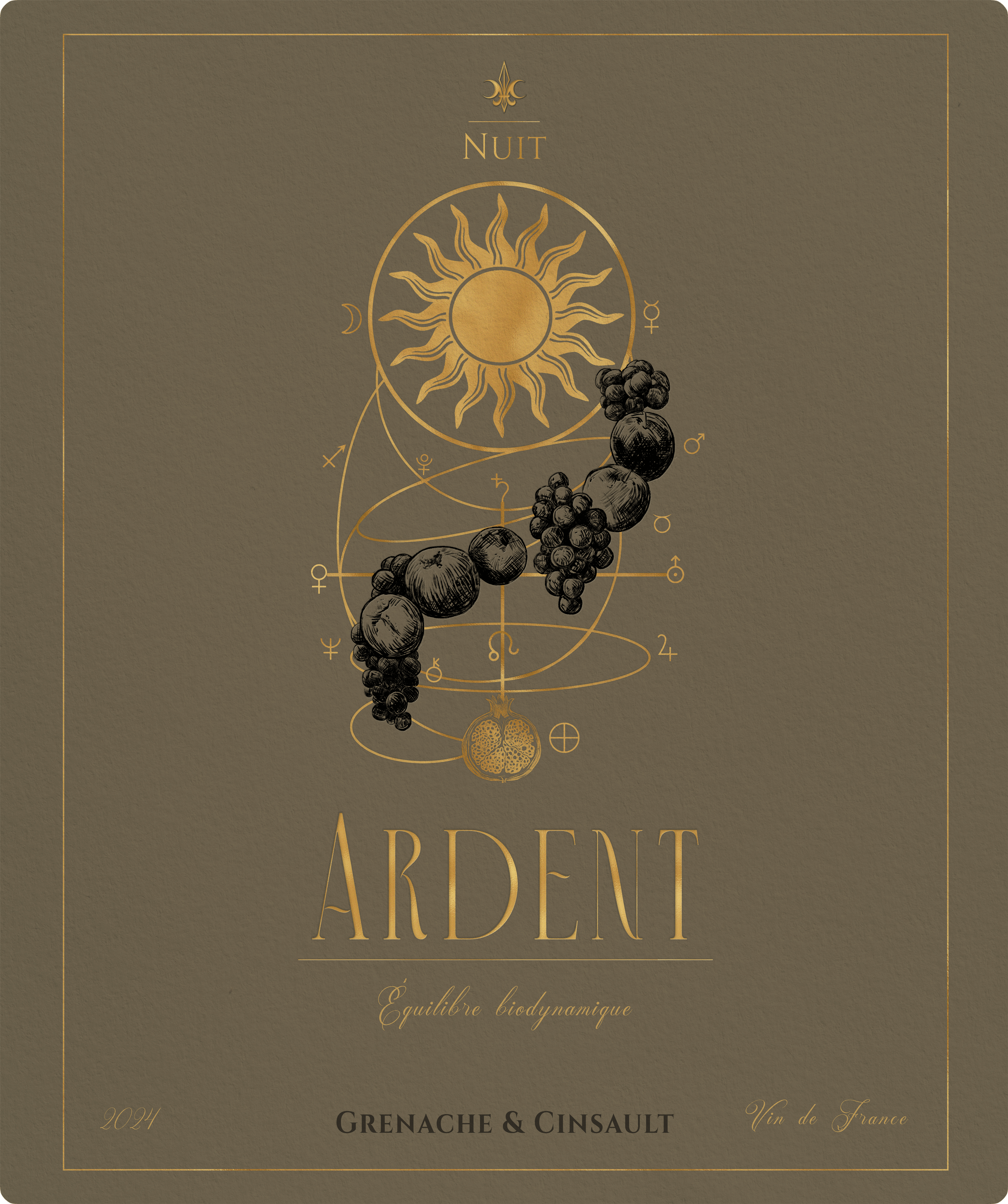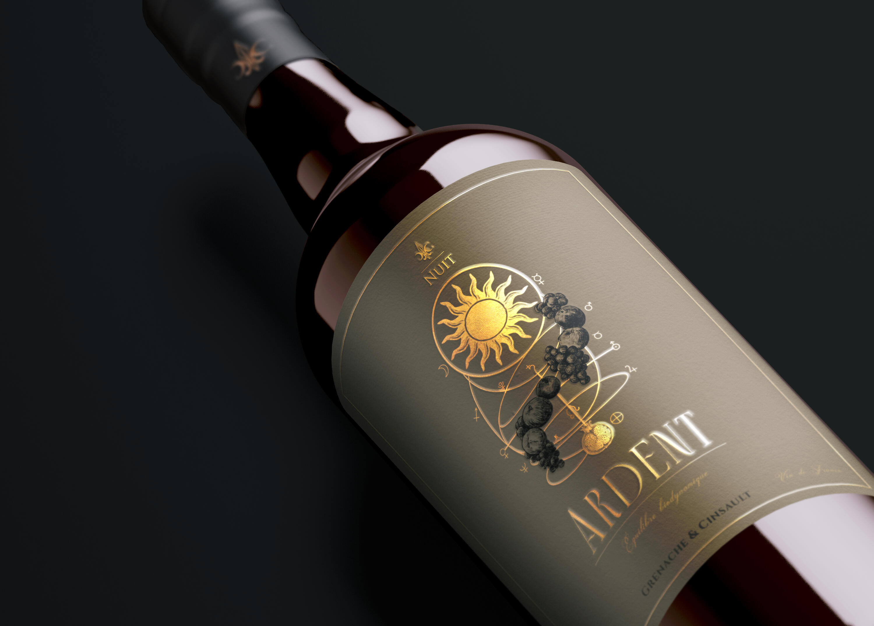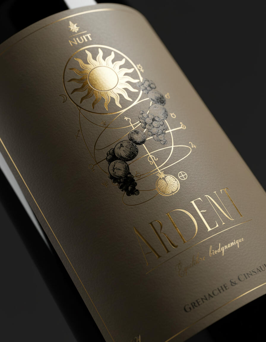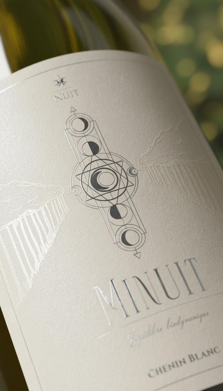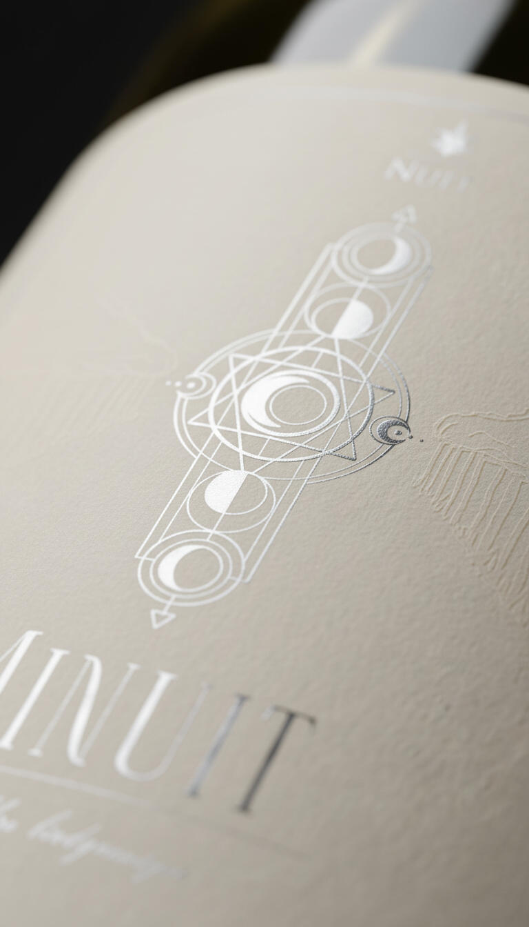 EN Nuit Biodynamique's design emerges as a set of diagrams from an alchemical science, where technical rigor meets the sensibility of the human touch to translate the biological truth of the wine. Through celestial geometries and the symbolism of lunar phases, each label decodes the rhythm between heaven and earth, manifesting a physical unity of earthy tones and embossed finishes that prepare the palate for the density of each vintage. This is a celebration dedicated to the appreciator who respects the mystery of the process, bringing the cosmic to the center of the table as the final link in a chain that begins with pruning under the stars and ends in a profound sensory experience. Nuit is, therefore, an invitation to decipher what is in the glass through the eyes of the universe: where art becomes the map, and wine, the destination.BR O design de Nuit Biodynamique nasce como um conjunto de diagramas de uma ciência alquímica, onde o rigor técnico encontra a sensibilidade do traço humano para traduzir a verdade biológica do vinho. Através de geometrias celestiais e do simbolismo das fases lunares, cada rótulo decodifica o ritmo entre o céu e a terra, manifestando uma unidade física de tons terrosos e relevos que preparam o paladar para a densidade de cada safra. Esta é uma celebração dedicada ao apreciador que respeita o mistério do processo, trazendo o cósmico para o centro da mesa como o elo final de uma corrente que começa na poda sob as estrelas e termina em uma experiência sensorial profunda. Nuit é, portanto, um convite para decifrar o que está na taça através dos olhos do universo: onde a arte se torna o mapa, e o vinho, o destino.