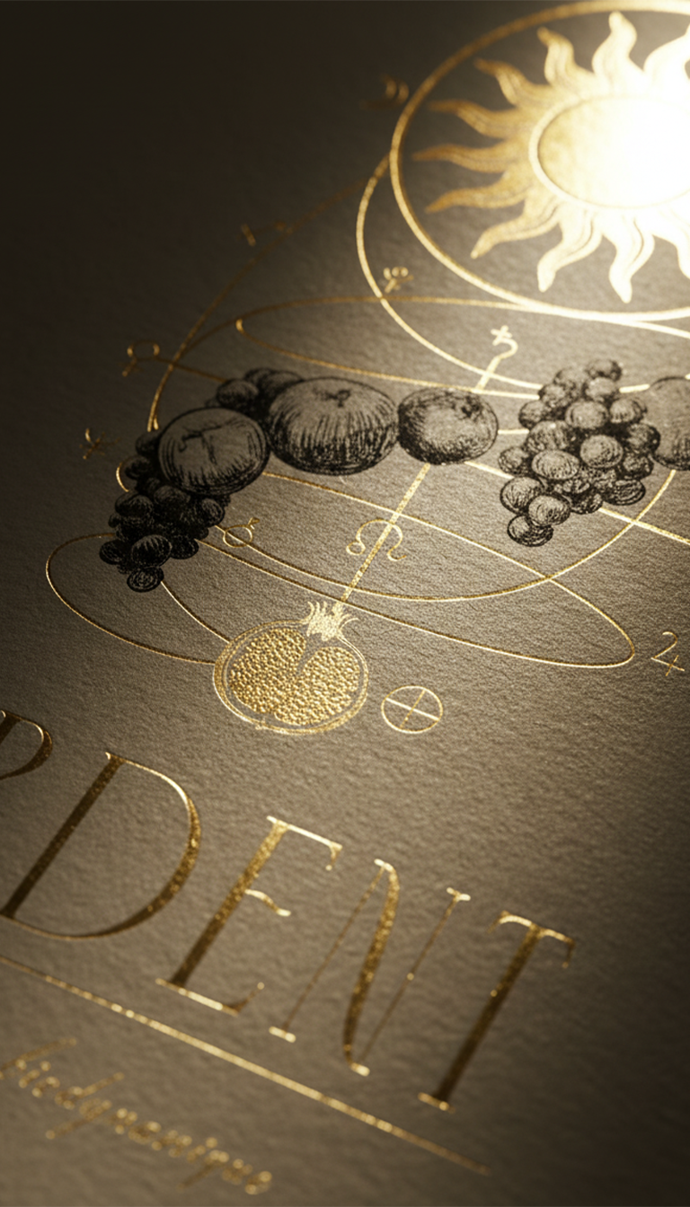The warmth of life. Here, the helical design intertwines fruits and planetary symbols, representing maturation under solar influence and the vibrant force of red blends.O calor da vida. Aqui, o modelo helicoidal entrelaça frutas e símbolos planetários, representando a maturação sob a influência solar e a força vibrante dos blends tintos.