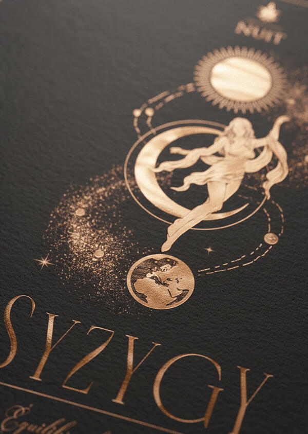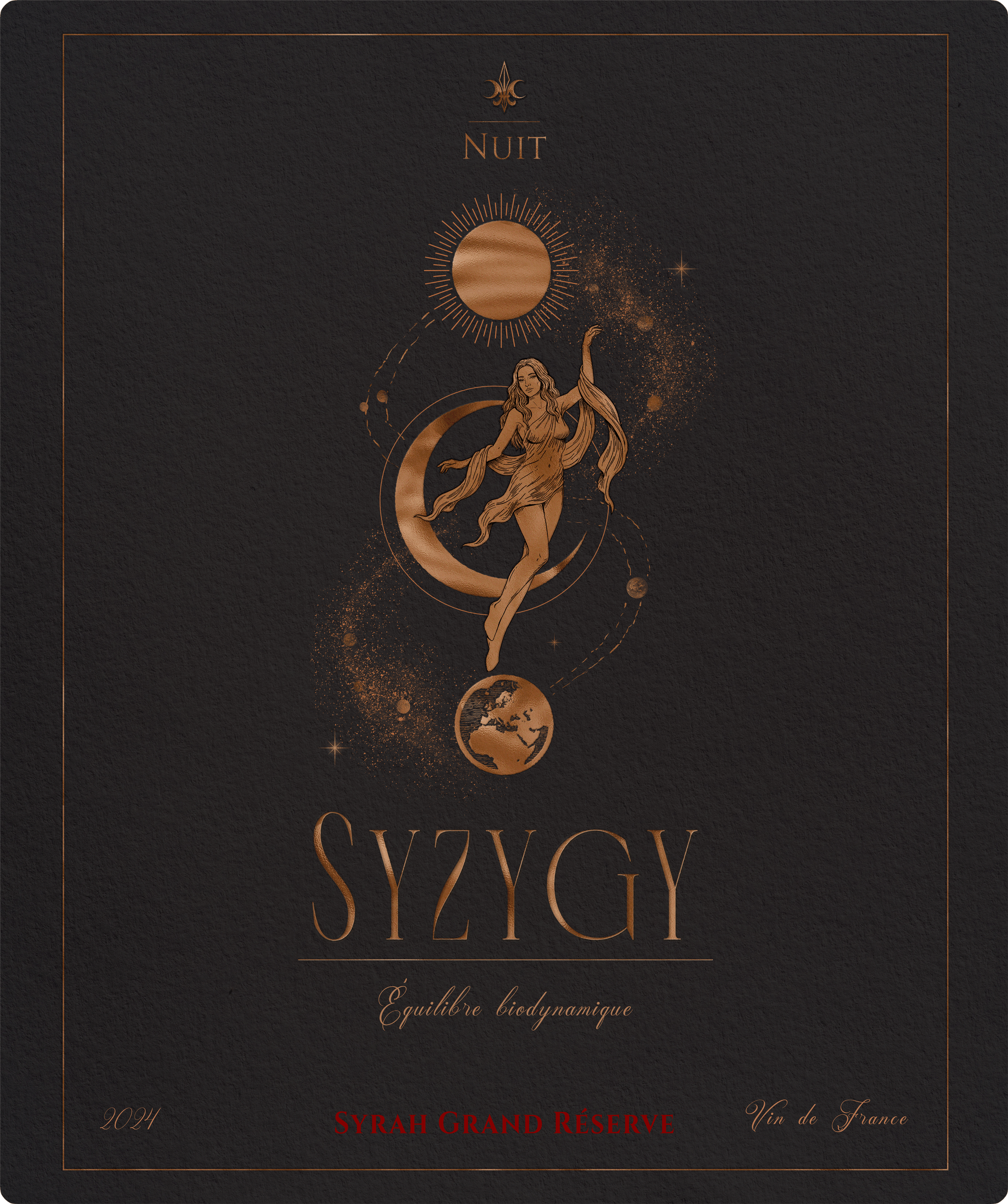 The ultimate alignment. Inspired by the rare astronomical phenomenon, the female figure embodies the soul of wine, connecting the Sun, the Moon, and the Earth in a dance of complexity and depth. It is the densest and most robust label, representing the pinnacle of the process where technique meets transcendence.O alinhamento máximo. Inspirado no raro fenômeno astronômico, a figura feminina personifica a alma do vinho, conectando o Sol, a Lua e a Terra em uma dança de complexidade e profundidade. É o rótulo mais denso e robusto, representando o ápice do processo onde a técnica encontra a transcendência.